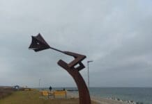 Wenn man Heiligenhafen Richtung Westen verlässt, muss man erst einmal an den Bausünden der 1970er Jahre vorbei – und trifft dann auf einen Mann im Sturm und die Ruinen eines alten Schießstandes.