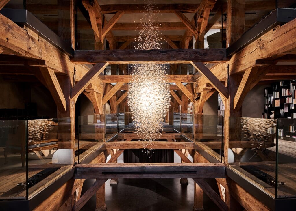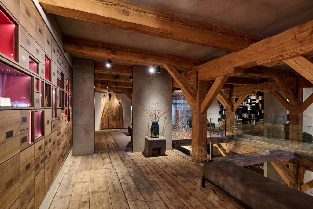 Die vier Bibliotheken im Haus erzählen 38 Lebensthemen, wie beispielsweise die Themen Wandel, Zeit und Spiel durch einzelne Kunstwerke. Nur ein paar Schritte weiter öffnet sich die Pforte zum „Paradies“. So nennen Angern und Morenz das Gemeinschaftsgrab im Kolumbarium. Der Künstler Aron Demetz aus Italien hat eine Tür aus einer 1000 Jahre alten Pappel geschaffen, die in den Tiefen eines Moores konserviert und so schwer ist, dass sie es mit einem Fels aufnehmen kann. Die Urnen dahinter stehen in Regalen und werden durch die mächtige Tür verschlossen.