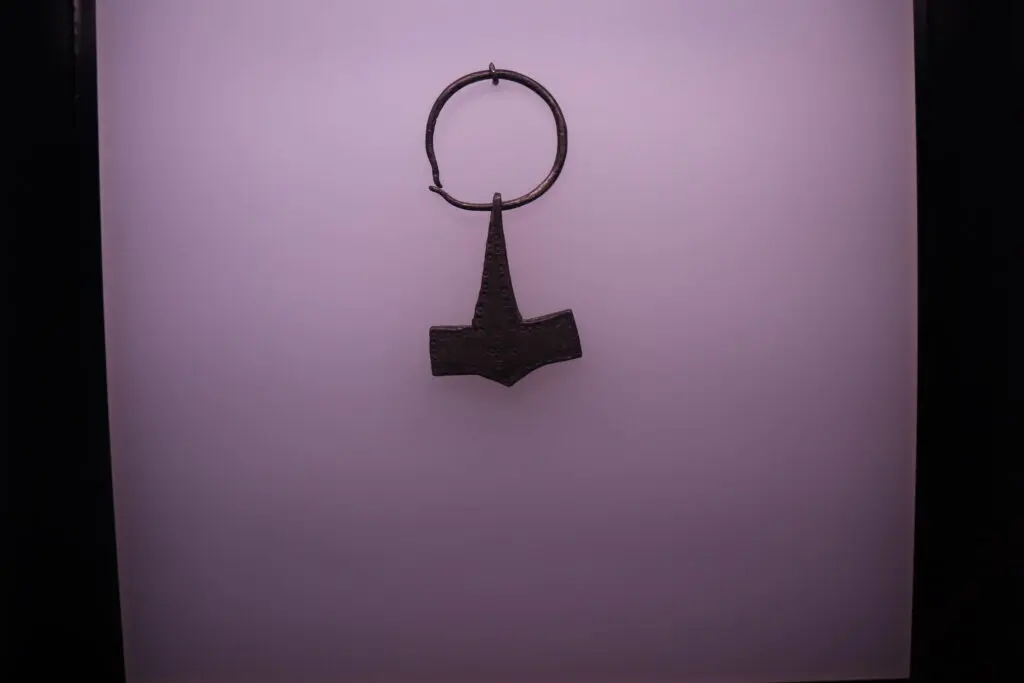 Der Glauben an Odin und Jesus wurde sogar miteinander vermischt. Ganz eindrücklich zeigt das ein Ausstellungsstück in Haithabu: ein Symbol, das Hammer und Kreuz in einem zeigt. Odin und Jesus, miteinander statt gegeneinander.