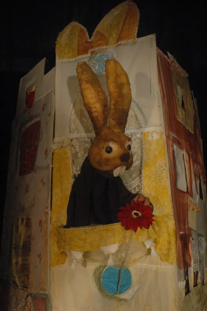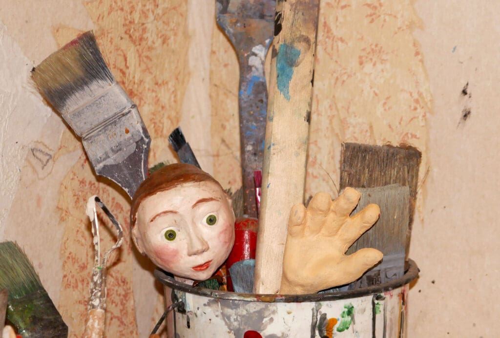 Für die kreative Arbeit bietet das Haus im Umland von Malente viel Platz. Vom Probenraum geht es in die Werkstatt, in der Pinsel, Werkstoffe und Puppen in verschiedenen Stadien liegen. Weitere, bereits fertige Figuren hängen oder stehen in einer Kammer neben dem Probenraum. Darunter sind „Herr Hase“ mit langen Ohren und Strickpullover, die Silhouette einer Ziege mit Geige, die wie ein Schattenriss wirkt, eine übergroße Uhr. Die Figuren lässt sie meist von ihrem Mann anfertigen: „Sehr praktisch, einen Bühnenbildner und Puppenbauer im Haus zu haben“, lacht die 50-jährige Künstlerin.