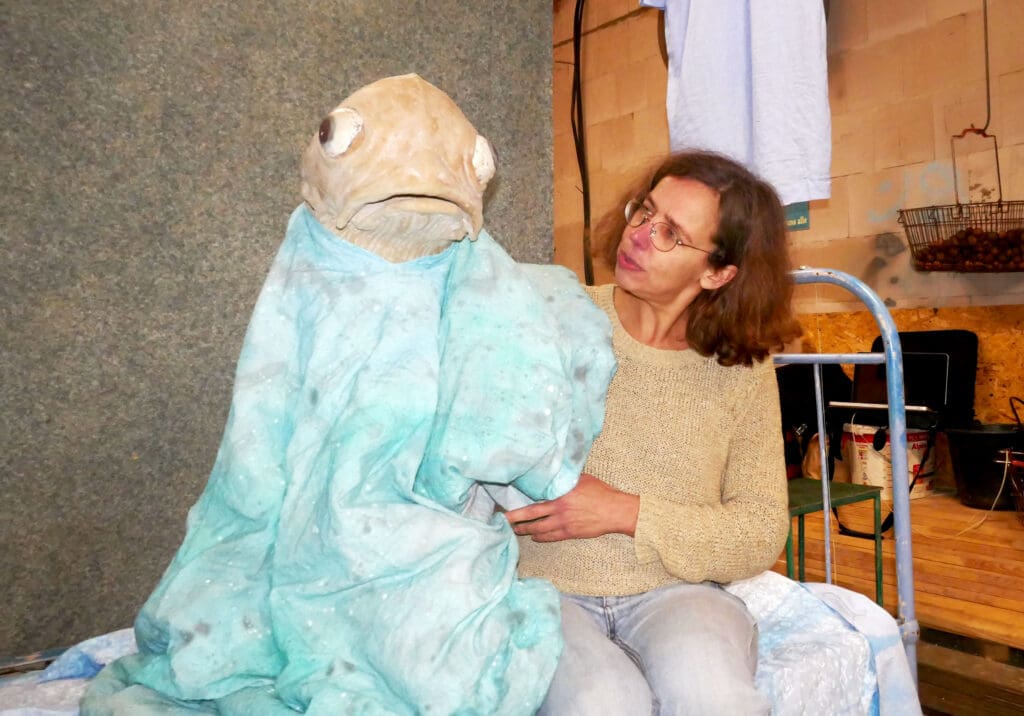 Karin Schmitt sitzt mit einem Fisch im Bett. Der Fisch hat große, runde Augen und ein breites Maul, trägt ein langes, bläulich-weißes Gewand, die Farbe erinnert an Wasser, der Schnitt an ein Nachthemd. Er bewegt sich, wenn Karin Schmitt den Arm bewegt. Die Puppenspielerin trägt Pullover und Jeans, es ist kühl in ihrem Probenraum, der einen Teil des Resthofes bei Bad Malente bildet, in dem Schmitt mit ihrer Familie wohnt.