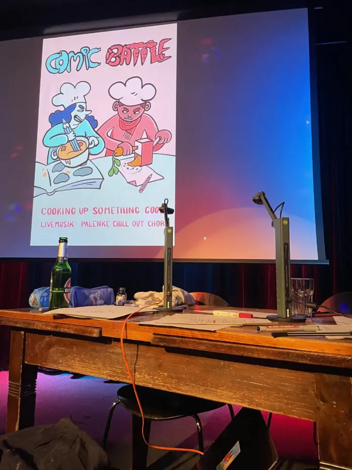 Beim Comic-Battle traten vier Illustrator:innen an – die meisten von ihnen studieren an der Muthesius Kunsthochschule. Spontan meldete sich auch noch eine fünfte Person, ein Besucher aus dem Publikum, der bereits bei vergangenen Battles als Zuschauer dabei war und nun als Wildcard-Zeichner selbst den Stift in die Hand nehmen wollte.