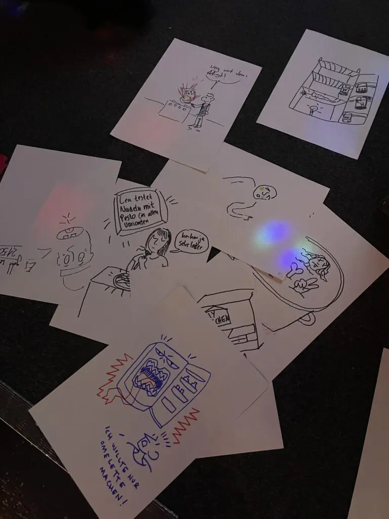 Besonders unterhaltsam wurde es beim Motto „hässlich zeichnen“. Zwei Freiwillige aus dem Publikum, die von sich sagten, normalerweise nicht zu zeichnen, sollten sich beim Katerfrühstück darstellen. Das Ergebnis: ein Shake bestehend aus Konterbier, Sprotten und ganzen Eiern. Die andere Person zeichnete ein singendes, vor fetttriefendes Käsetoast, gezeichnet mit viel Humor und Selbstironie.