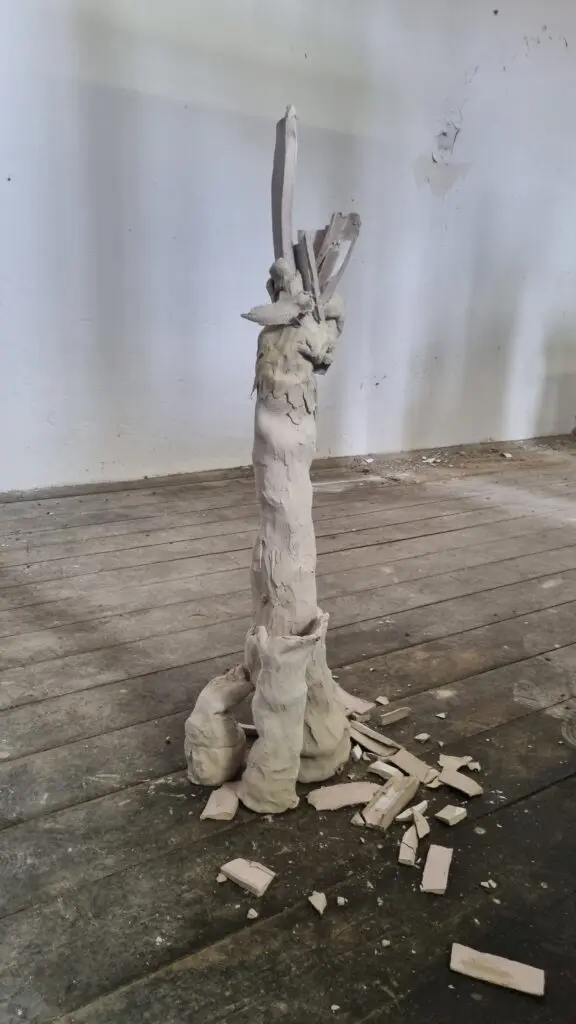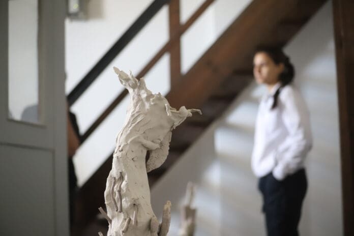 Die hölzernen Dielen knarren bei jedem Schritt. Von den Wänden platzt die graue Farbe ab. Auf dem Holzboden liegen trockene Tonbrocken, die von den hüfthohen Skulpturen bröseln. In diesem Turmzimmer der Gemeinschaftsschule am Brook in Kiel-Gaarden hat Nadine Kles in den vergangenen Monaten viel Zeit verbracht. Seit November hat sich die Hamburger Künstlerin über den Dächern Kiels ein Atelier eingerichtet. Möglich gemacht hat das eine Artist-in-Residency, ein Förderprogramm für Künstler*innen, das im Rahmen des Projekts „going public – Von öffentlichem Interesse“ entstanden ist. Dahinter steht eine Idee von Sven Christian Schuch, dem künstlerischem Leiter des Kunstraums „spce“ der Muthesius-Kunsthochschule. Das Projekt will Orte des öffentlichen Raums mit Kunst versorgen. So ging die Künstlerin zweimal pro Woche wieder zur Schule. Mit Heizstrahler, warmer Daunenjacke und viel Inspiration.