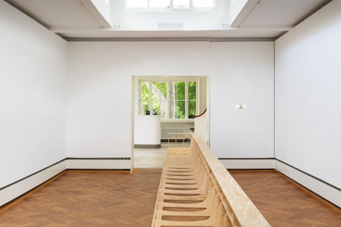 Gleich im Foyer fällt eine lange Konstruktion aus hellem, unbehandeltem Holz ins Auge. Unüblich platziert, gleichsam mitten im Weg ragt sie aus dem Eingang zum Ausstellungsraum heraus und lädt ein, ihr zu folgen. Auffallend ist die gleichmäßige repetitive, skelettartige Struktur dieses hölzernen Gerüsts, die sich raumeinnehmend in einer eckigen U-Form durch den gesamten Pavillon erstreckt. Sie ist an den Grundriss der modernen Ausstellungsarchitektur angepasst und bildet das zentrale Werk der Schau: „Audience. Hier im lichtdurchfluteten Pavillon, dessen warmtöniger Fischgrätparkettboden und die vielen Fenster eine fast wohnliche Atmosphäre erzeugen, steht die ortsbezogene Rauminstallationin einem spannungsvollen Kontrast zur Umgebung. Zugleich weist sie den Weg durch die Ausstellung: Wer alle Arbeiten sehen möchte, muss einmal komplett um sie herumgehen.