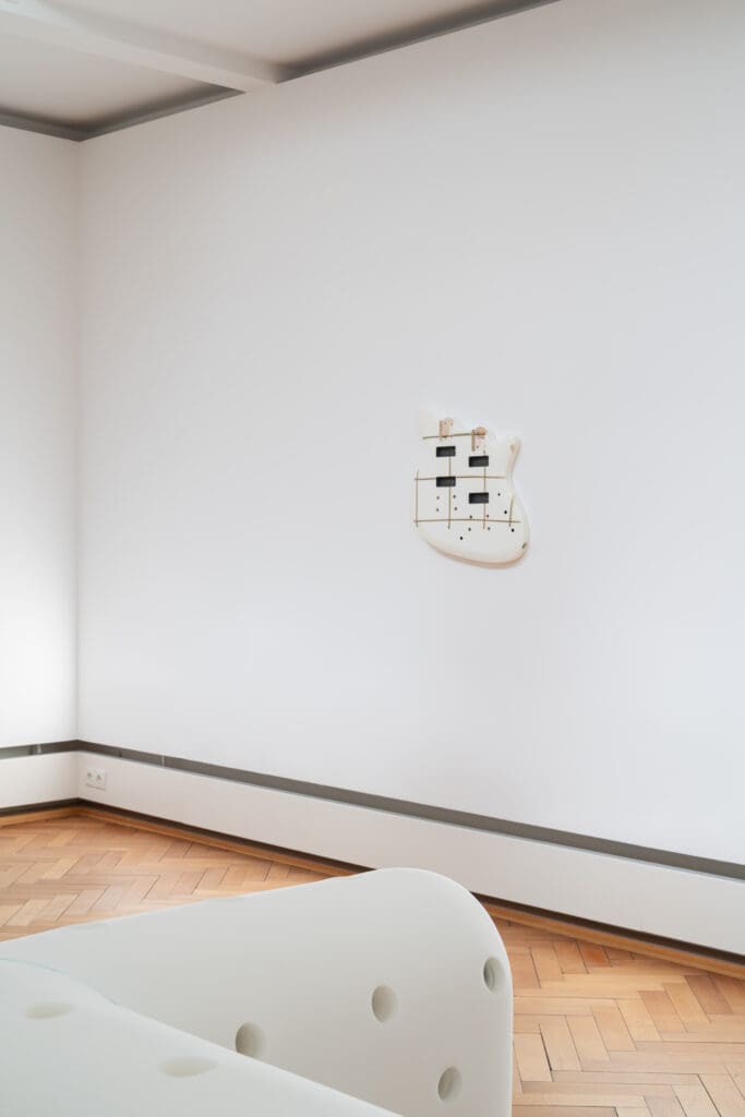 Von „Audience“ führt der Blick zu einer weiteren Arbeit, „00010“ (2024). Ein Gitarrenkorpus, radikal aller Einzelteile entledigt und damit seiner ursprünglichen Funktion beraubt. Die Idee der Demontage, die sich schon im „Chesterfield-Sofa“ ankündigte, wird hier fortgeführt und auf die Spitze getrieben.