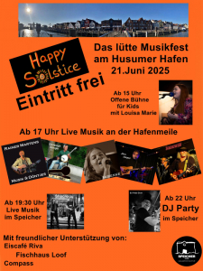 Solstice ist das englische Wort für Sonnenwende. Im Husumer Speicher wird der längste Tag des Jahres mit dem lütten Musikfest am Husumer Hafen gefeiert. Den Start macht die Offene Bühne für Kids (ab 15:00 Uhr). Bis zum frühen Abend gibt´s Live-Musik von Rainer Martens, Fabienne, Jörn Jasper, Janeway und Christoph Cringle an der Hafenmeile. Anschließend geht´s Indoor auf der Speicher-Bühne weiter.
