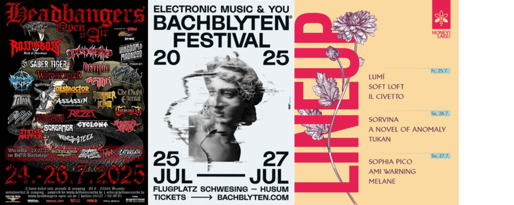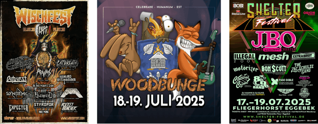 - [ABGESAGT!] 10. – 12. JULI: DANNEWERK OPEN AIR, DANNEWERK (SCHLESWIG-FLENSBURG) → pausiert 2025! Zu geringe Vorverkaufszahlen, gestiegene Kosten und die daraus resultierende Unsicherheit samt Risiken haben die Veranstalter dazu bewogen, das Festival knapp zwei Monate vor dem Termin abzusagen – ein Phänomen, das leider vermehrt vorkommt. Die aktuellen Herausforderungen der Festivals nimmt auch der NDR ins Visier: „Steigende Kosten und weniger Publikum: Haben Festivals eine Zukunft?“ (24. Juni 2025, ndr.de)