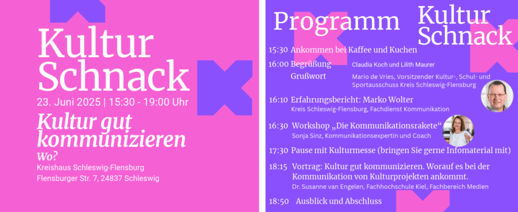 Am 23. Juni 2025 luden Claudia Koch und Lilith Maurer vom Kulturknotenpunkt (KKP) Nordost zur 9. Kulturkonferenz Schleswig-Flensburg ein. „Kulturschnack: Kultur gut kommunizieren“ lautete der Titel der diesjährigen Veranstaltung. In drei Fachbeiträgen ging es ganz konkret um praktische Empfehlungen. → Um das Profi-Wissen weiter zu tragen, haben wir in diesem Beitrag zehn Tipps für die Kulturszene zusammengefasst.