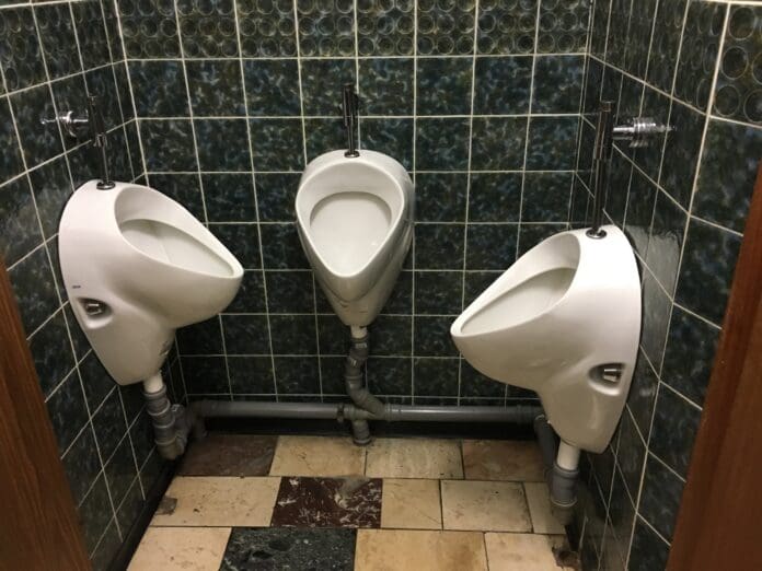 Drei Pinkelnde in diesem Raum? Ein Trio im Pinkulatorium. Hintern an Hintern an Hintern.