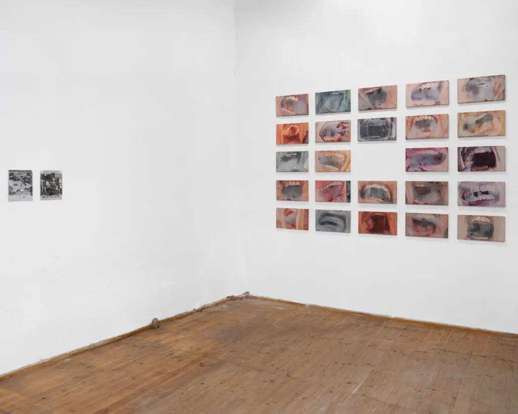Xiaoyi Zhan entwirft in ihrer Arbeit einen „kollektiven Schrei“ aus Fragmenten von Frauenmündern aus Horrorfilmen, die sie mit Duftwachs überzogen hat. Was zunächst als eingefangener Moment der Angst erscheint, wandelt sich in der Gesamtheit der Bilder zu etwas anderem: Wut und Aggressivität gehen von dieser Sammlung aus. Auch hier fügt sich die Vielzahl der Einzelwerke zu einer unerwarteten Gemeinschaft zusammen. Eine solche Verbindung würde man in der Ansammlung schreiender Münder zunächst nicht erwarten. Die Angst wird zur Waffe umgedeutet, der individuelle Schrecken zu kollektiver Macht.
