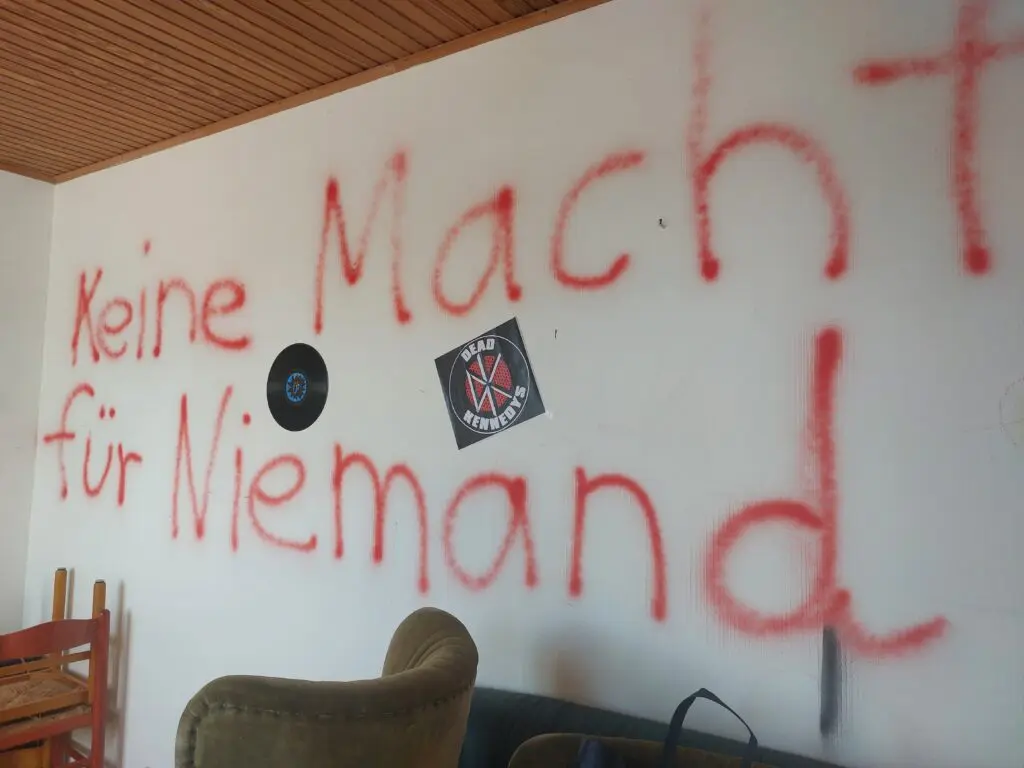 Ein Paar, das aus Hamburg zu Besuch ist, schaut sich zwischendurch in dem Haus um. „Habt ihr euch die Hafenstraße zum Vorbild genommen?“, fragen sie. Ein Gespräch entsteht, im Mittelpunkt steht die Frage danach, was Punk eigentlich ist. Olaf Gülzow und das Paar sind sich einig: eine Idee, eine politische Haltung, in deren Mittelpunkt Gerechtigkeit steht und: „Keine Macht für Niemand“.