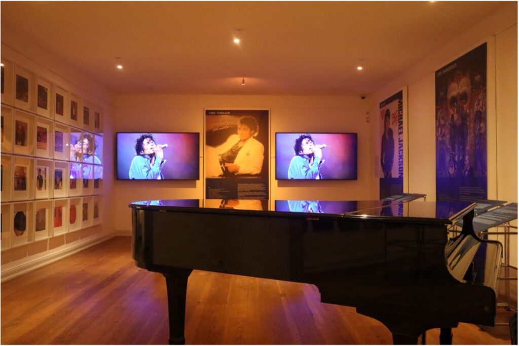 Begonnen wird jedoch nicht damit. Direkt nachdem man die Tür zu den Ausstellungsräumen öffnet, schallen Michael Jacksons Klassiker in den Ohren und die bunten Albumcover lachen einem entgegen. Man weiß direkt: Jetzt geht es um den King of Pop. Doch nicht nur das. Gleich am Eingang wird die Dualität des Künstlers als Ikone und als Mensch sichtbar. Zwischen den ersten Albumcovern der Band „Jackson 5“, in der er in seiner Kindheit und Jugend aktiv war, und tiefgründigen Gesprächen zwischen ihm und seinem Therapeuten Rabbi Shmuley Boteach sieht man den Künstler, um den sich viele Kontroversen ranken und auch die friedliebende, freundliche Person.