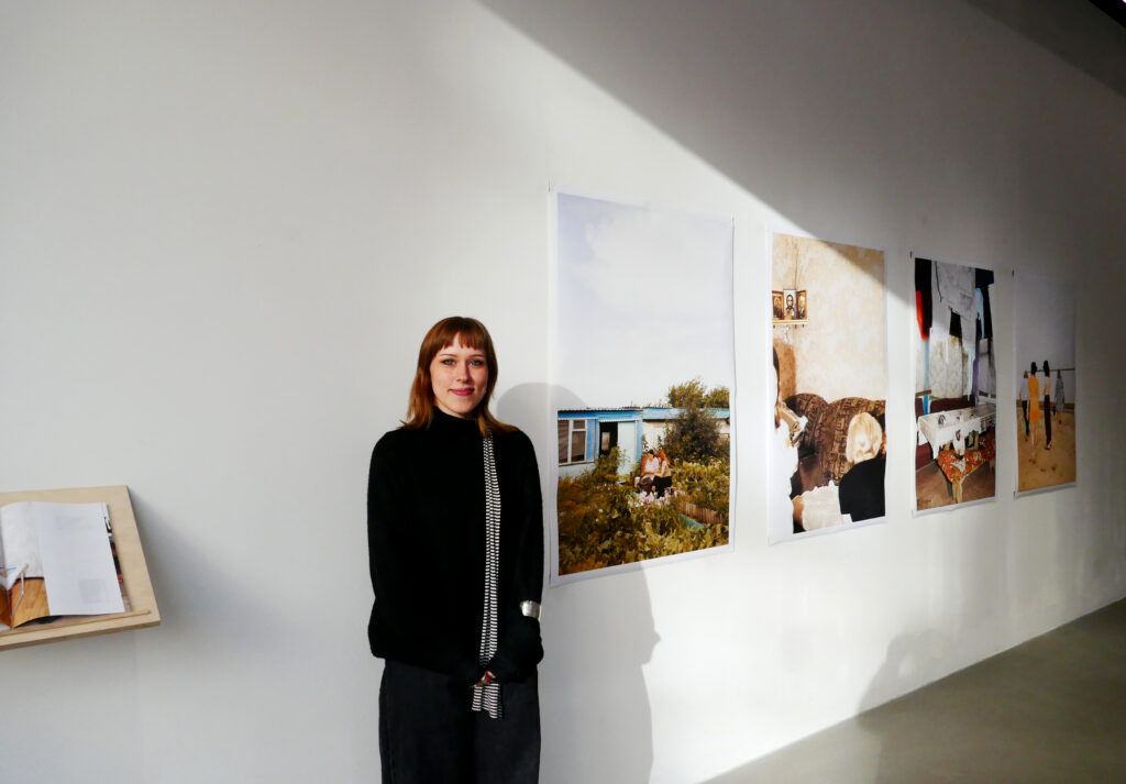 Auch Irina Janson arbeitet mit Fotos. „wie schön sind abende in gornyatski“, heißt ihre Abschlussarbeit im Studiengang Kommunikationsdesign. Die Gestalterin wurde 1998 im kasachischen Rudnyj geboren, zog aber als Kind mit ihren Eltern nach Deutschland. Um Heimat und Fremdheit geht es in ihrem Masterprojekt. Diese Gefühle verbindet Janson mit dem Häuschen ihrer Großeltern in Kasachstan, das sie als Kind oft besuchte. Nach dem Tod des Großvaters im Jahr 2023 kam die Familie dort noch einmal zusammen und räumte das Haus. Auch Irina Janson war dabei und fotografierte ihre Verwandten bei alltäglichen Arbeiten. Diese Fotos kombinierte sie mit älteren Familienbildern zu einem Fotobuch.