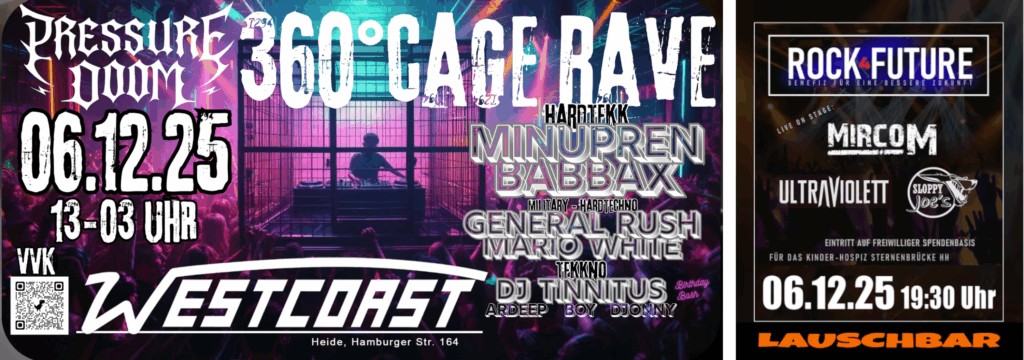 - 06. DEZEMBER: PRESSURE DOOM 360° CAGE RAVE, HEIDE → Bei diesem (Hard-)Techno-Event im Westcoast sind die DJs im wahrsten Sinne Zentrum des Geschehens: Die DJs stehen in der Mitte, das Publikum drumherum. Das Spektakel beginnt bereits um 13 Uhr.
