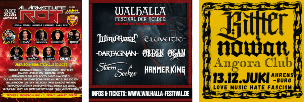 - 13. DEZEMBER: WALHALLA – FESTIVAL DER HELDEN, NEUMÜNSTER → Sechs Bands bringen Metal- und Mittelalter-Rock in die Holstenhallen. Camping ist möglich.