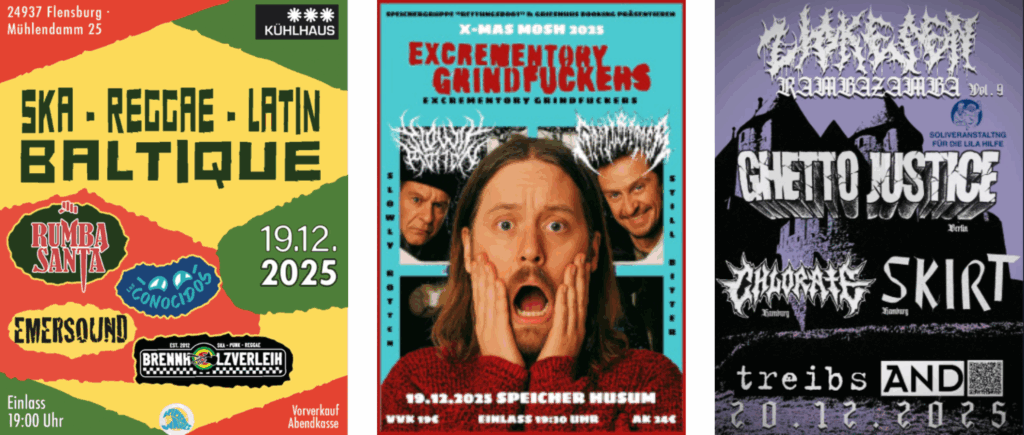 - 27. DEZEMBER: FCK 2025, KIEL → Zwischen Weihnachten und Silvester öffnet auch die Schaubude nochmal die Türen. Kredenzt werden Metalcore und Post-Grunge von Domain of Decay (Kiel), FYVR (Hamburg) und Quiet Girl (Lübeck).