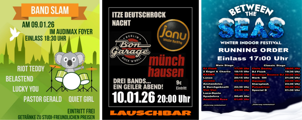 - 09. JANUAR: (COAL) BAND SLAM, LÜBECK → [Update vom 08. Januar: Aufgrund der Wetterlage fällt der Band Slam aus. Ein Ersatztermin folgt.] Das Campus Open Air Lübeck (COAL) veranstaltet einen Band Slam im Audimax. Die Bewerbungsphase ist bereits abgeschlossen. Beim Band Slam spielen fünf Newcomer-Bands um einen Slot beim diesjährigen COAL. Festivaltermin: 29. Mai.