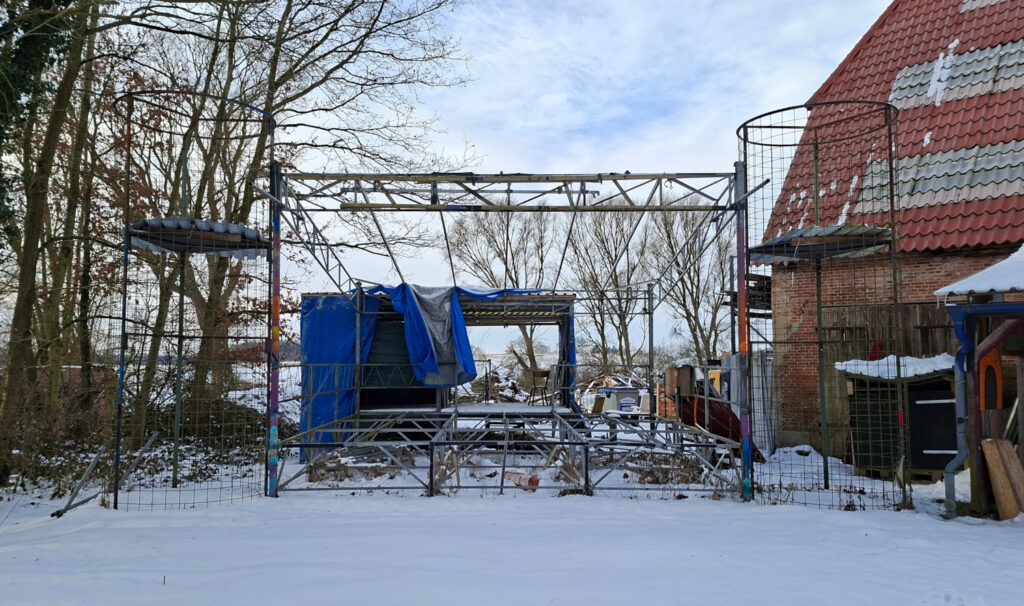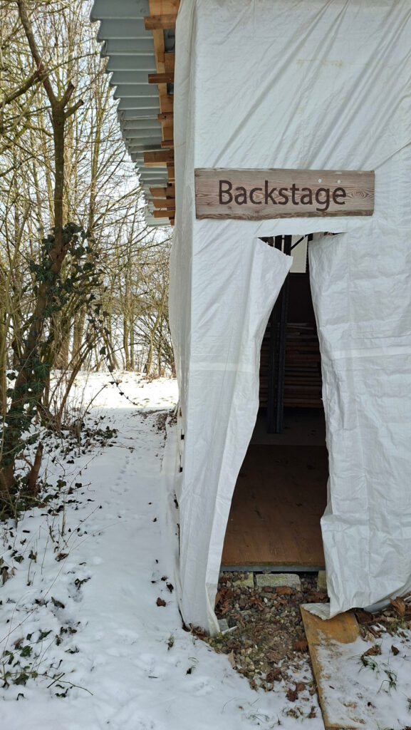 Festival – das heißt Musik, Trubel, viele Menschen, bunte Zelte, Essensgeruch aus Imbissbuden. Aber was passiert eigentlich, wenn die Lautsprecher und Scheinwerfer ausgeschaltet sind, wenn die Bühne abgeräumt ist und das Publikum den Platz verlassen hat? Für kulturkanal.sh hat sich Wiebke Wimmer auf den Weg gemacht und das Gelände des Lala-Festivals in Negenharrie bei Bordesholm besucht. Beim Fototermin lag es noch im Winterschlaf unter einer weißen Schneedecke.