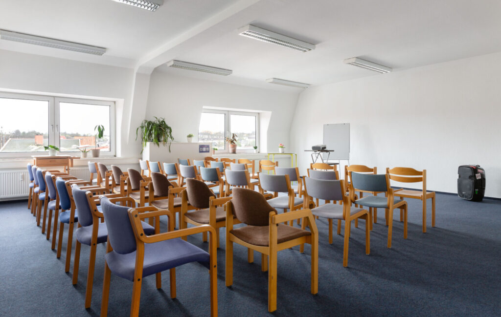 Mehrere Treppen geht es hinauf bis zur Tür, hinter der die „Blau:pause“ anfängt. Dahinter liegt ein Flur, in dem eine Kaffeemaschine steht – das belebende Getränk gibt es gegen eine Spende. Vom Flur gehen Räume in unterschiedlichen Größen ab, die sich für ganz verschiedene Aktivitäten eignen. In der „Kleine Pause“ mit elf Quadratmetern können sich bis zu acht Personen um einen ovalen Tisch versammeln, in die „Große Pause“ passen 45 Stühle für Vortragsveranstaltungen. Die „Bewegungspause“ hat einen glatten Boden für Sport jeder Art, und im Coworking Space können bis zu 15 Personen an Schreibtischen arbeiten und schnelles Internet nutzen.
