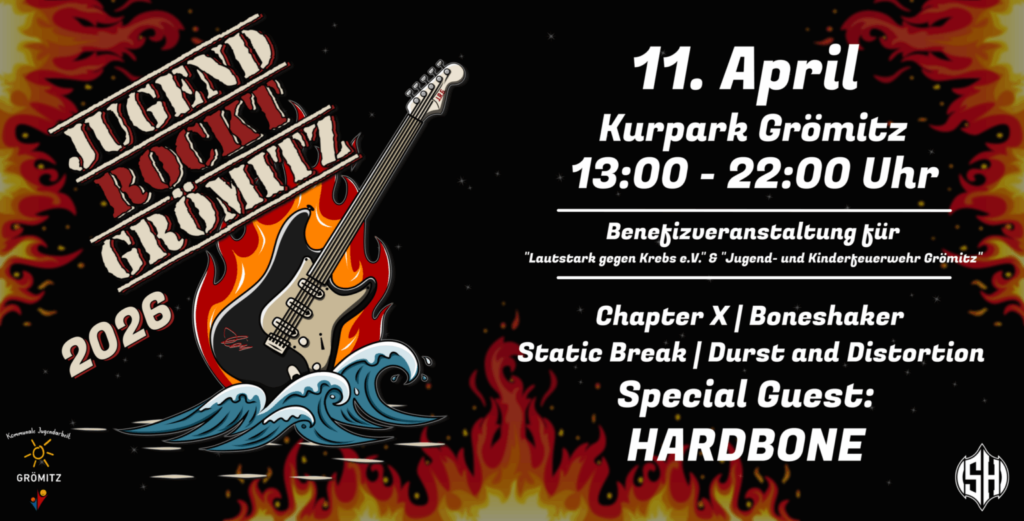 - 11. APRIL: JUGEND ROCKT GRÖMITZ, GRÖMITZ (OSTHOLSTEIN) → PREMIERE! Das Festival des Jugendzentrums Grömitz ist neu „und knüpft zugleich an eine lokale Tradition an. Das Event gilt als geistiger Nachfolger des legendären Grömitz goes Rock, das zuletzt im Jahr 2011 stattfand“, steht auf der Webseite. Aber bei Jugend Rockt Grömitz ist der Name Programm: Den Fokus legt das neue Festival auf Jugend- und Newcomerbands aus der Region. Es spielen u. a. Chapter X (Timmendorfer Strand), Static Break (Fehmarn) und Boneshaker (Ostholstein). Bei Jugend Rockt Grömitz wird zudem für den guten Zweck gerockt: Das Festival sammelt Spenden für Lautstark gegen Krebs e.V. und die Jugend- & Kinderfeuerwehr Grömitz. Der Eintritt ist frei, Spenden sind willkommen. Location: Kurpark Grömitz