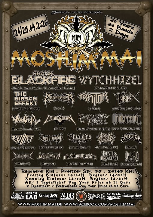 - 24. – 25. APRIL: 20 JAHRE MOSH IM MAI, KIEL → Zum 20. Jubiläum von Mosh im Mai verdoppelt das Metal-Festival Bands und Festivaltage: 20 Bands spielen an zwei Tagen in der Räucherei.